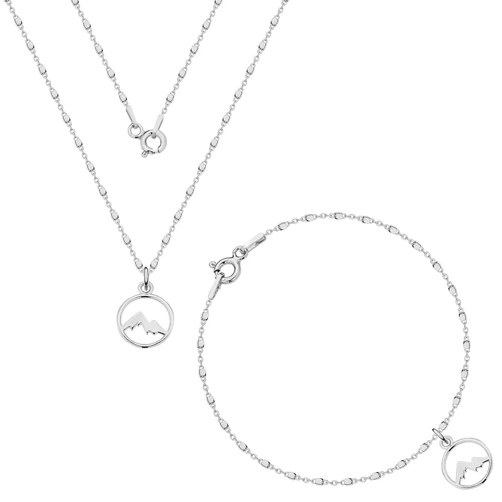 W skład zestawu wchodzi: naszyjnik i bransoletka na ozdobnym łańcuszku z zawieszką z motywem gór.