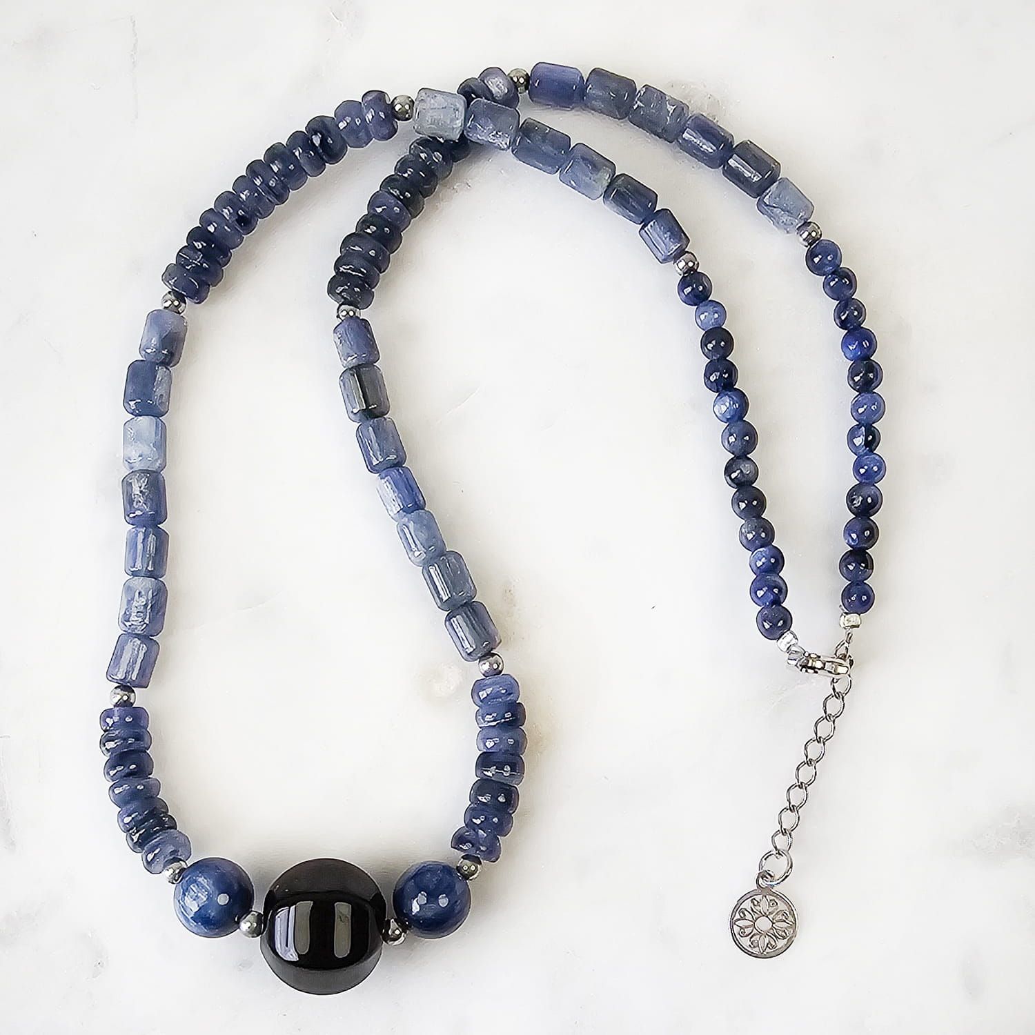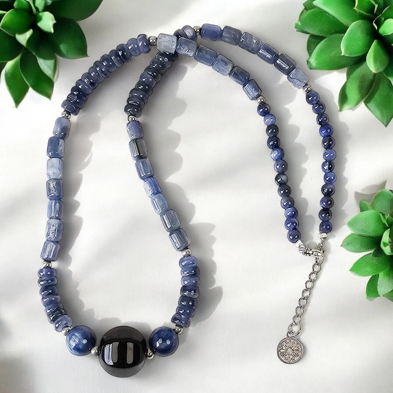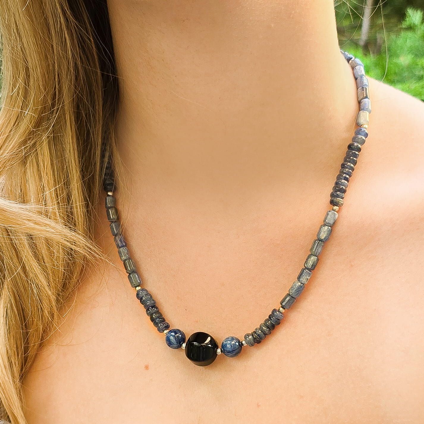 Elegancki i niepowtarzalny naszyjnik wykonany z naturalnych kamieni szlachetnych i półszlachetnych, wykończony rodowanym srebrem. Kamienie: kyanit, onyks Długość naszyjnika (regulowana): 45 cm + 3 cm Istnieje możliwość wykonania na zamówienie naszyjnika innej długości (w tej samej cenie). Wielkość kamieni: 14 mm (duży kamień na środku), 4, 6, 8 mm (pozostałe kamienie) Kruszec: rodowane srebro próby 925 |