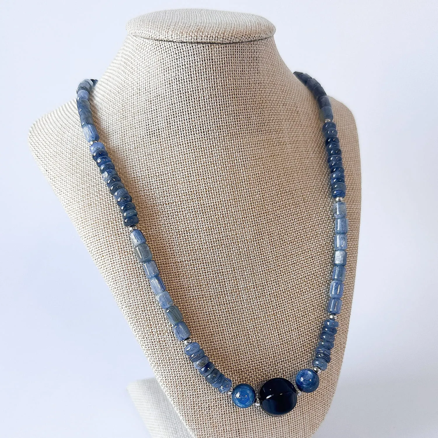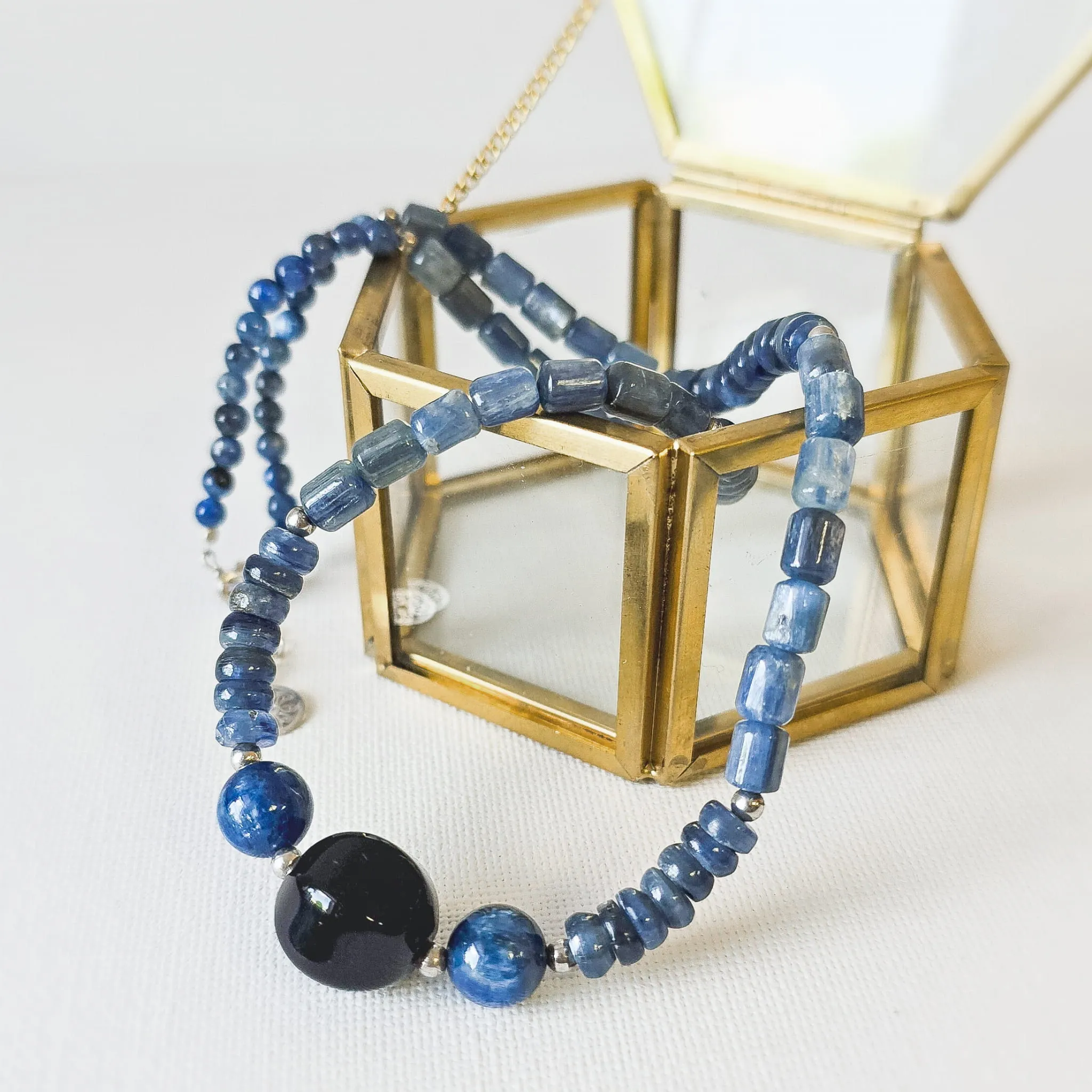 Naszyjnik z kamieni naturalnych kyanit onyks srebro rodowane
